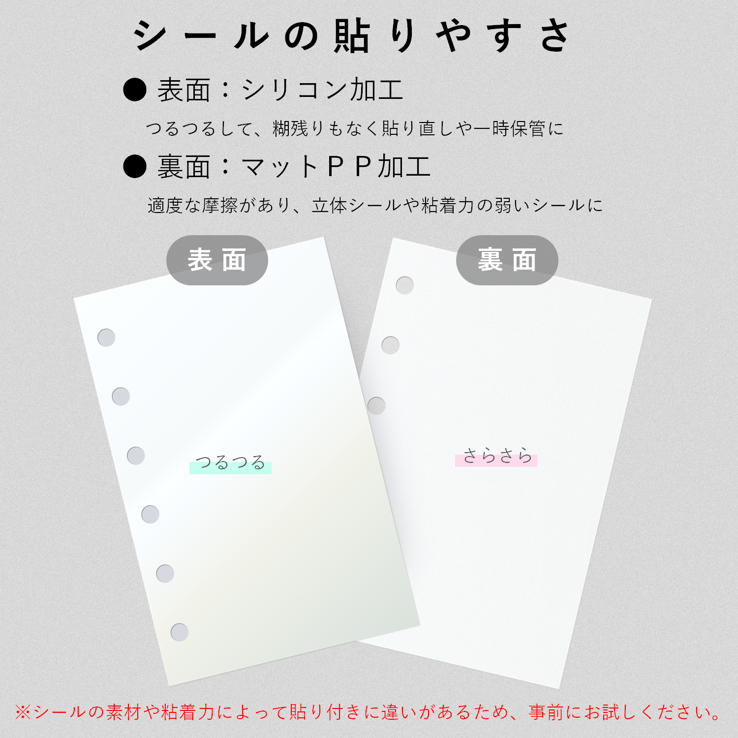 ツルツルのシリコン加工面、サラサラのマットPP加工面。シール粘着力に応じて安定して貼り付けやすいシール台紙です。適度な厚さの紙質で、普通の台紙よりも折れづらく破れにくいため、シールのコレクションや交換などに最適です。