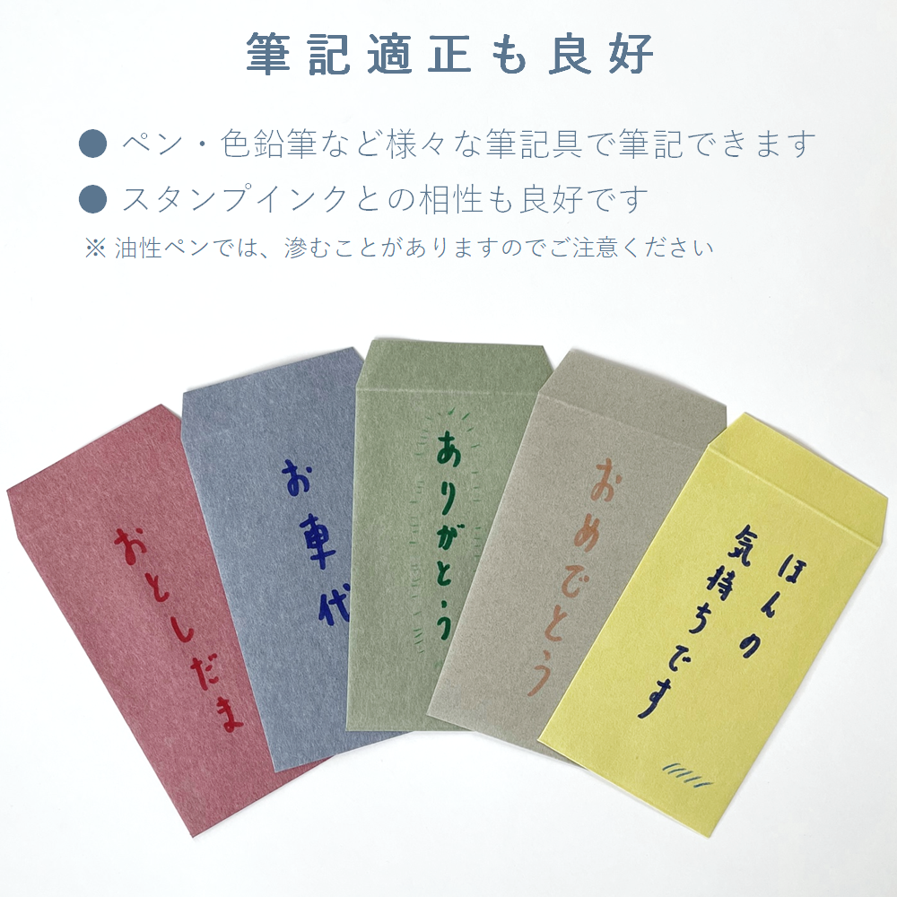 ペン・色鉛筆など様々な筆記具がご使用でき、スタンプインクとの相性も良いので、メッセージなどの書き込みにも適しています。(油性ペンでは、滲むことがありますのでご注意ください)