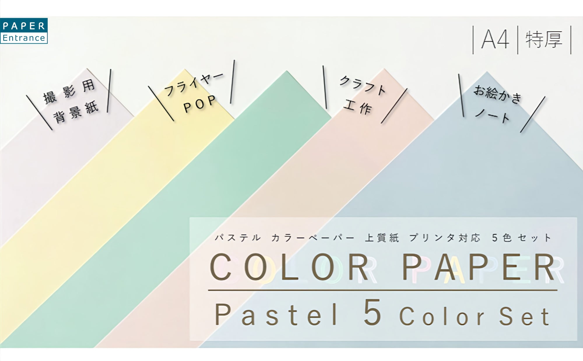 淡いパステルカラーの上質紙5色セット。撮影用背景紙・工作・フライヤー・POP・台紙・席札など、幅広い用途でお使いいただけます。