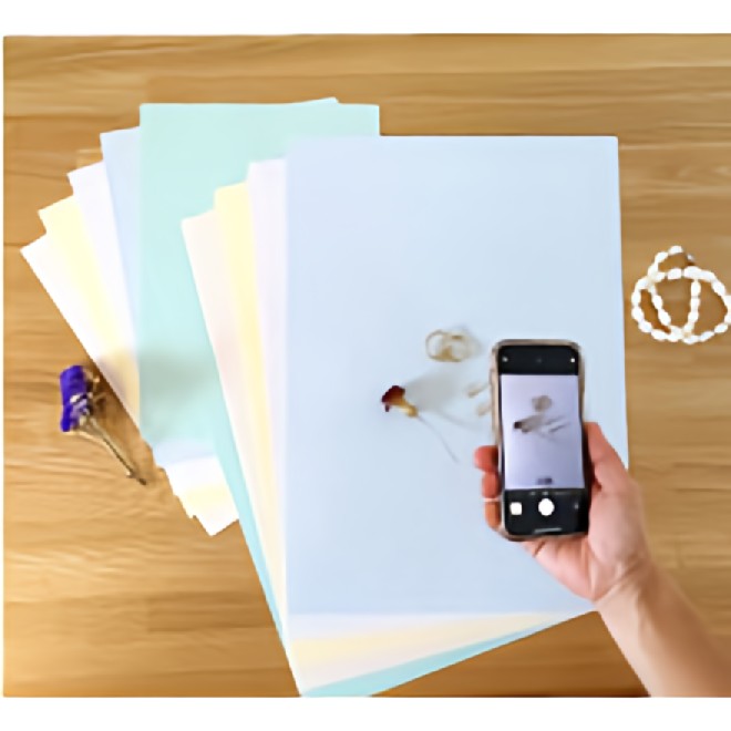 被写体が引き立つように、色種・色調のバランスを考慮した淡い5色を1パックにおまとめしました。フリマアプリの撮影用背景紙に最適です。同封のあて紙はレフ板としてお使いいただけます。