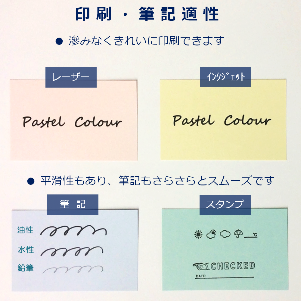 レーザー、インクジェットなど各種プリンタでの印刷適性があります。厚みのあるフライヤー・チラシ・POP・チケットなどに最適です。5色入っておりますので、内容や季節に応じて色を変えたりできます。