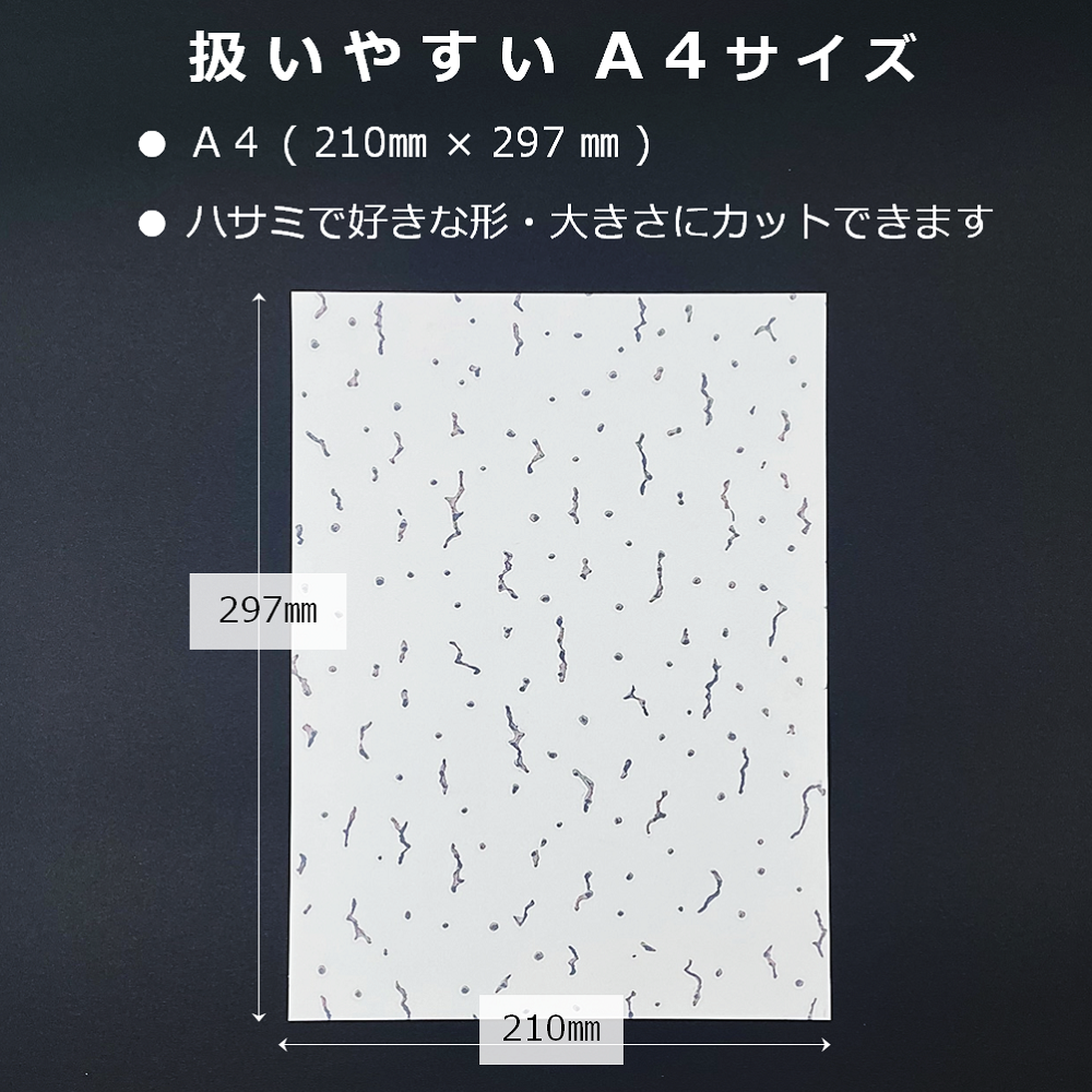 多くの天井に使用されている建築資材の模様「トラバーチン」。家の天井や店舗、オフィス・病院などの様々な施設の天井補修にお使いいただけます。お好みのサイズや形にカットしてそのまま貼れますので、めんどうな作業は一切なしで簡単に天井補修ができます。