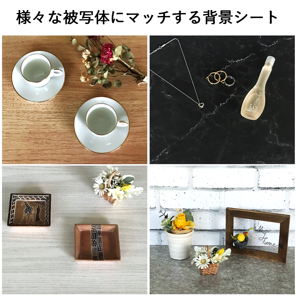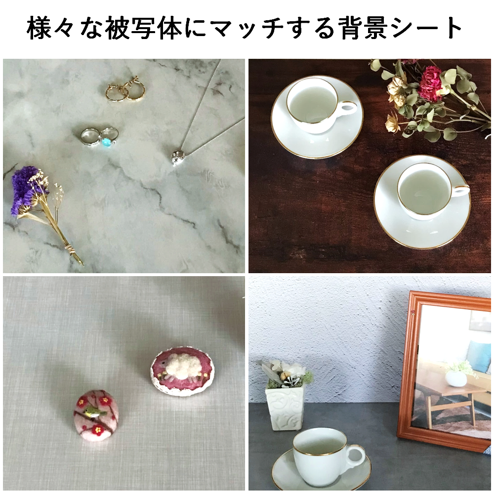 アクセサリー、小物、ファッション、雑貨、食器、アートなど、様々な被写体にマッチする背景シート、10種入り。フリマアプリの出品や、ハンドメイド作品の撮影に最適です。