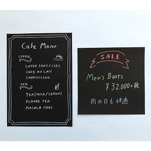 深みがある美しい黒色なので、白・金・銀やカラフルな不透明インクのペンを使うとより一層文字が引き立ちます。紙ムラが少なく、平滑度の高い黒色の色上質紙です。