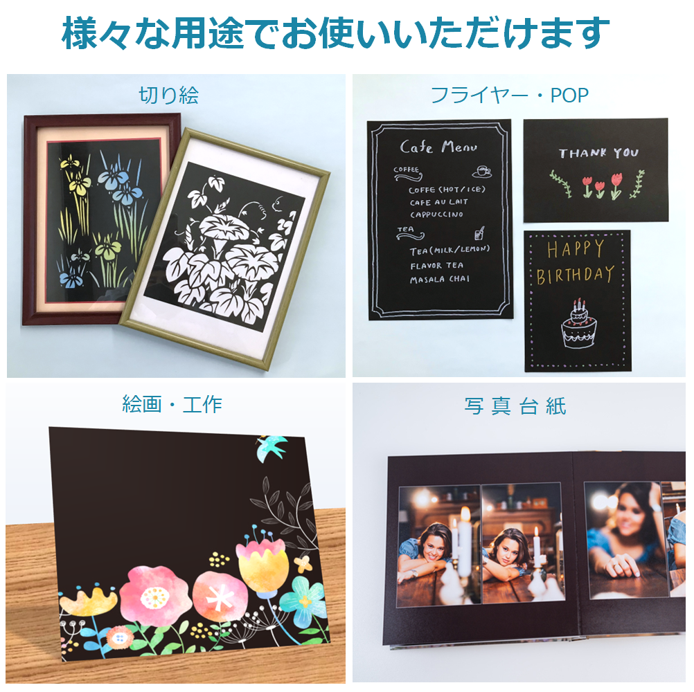 ファイルの仕切紙、写真の台紙などにお使いいただけます。深みのある黒なので写真も映え、厚すぎないのでアルバムやファイルもスッキリとまとまります。