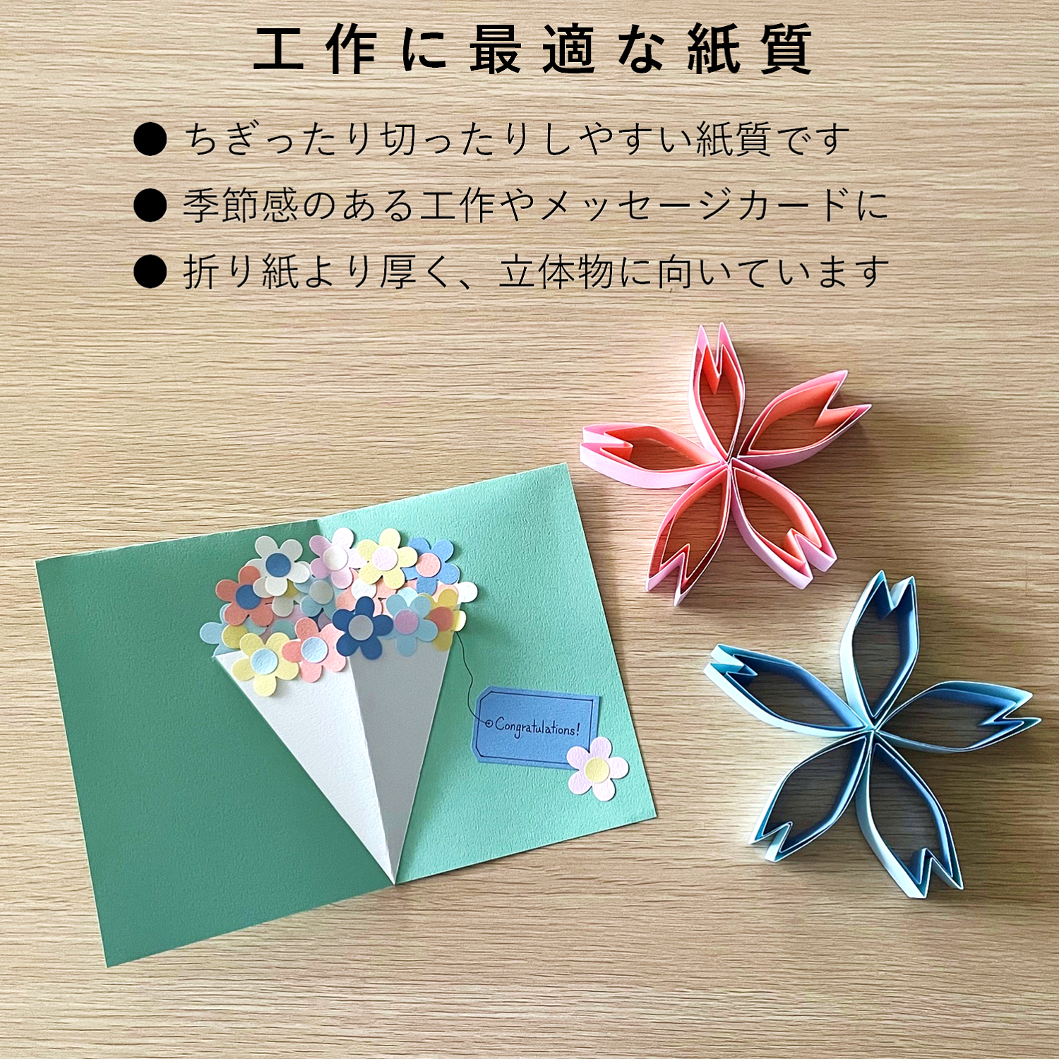 ちぎる、折る、貼る。紙遊びや工作が楽しくなる適度な厚みと色み。季節のモチーフを切り抜いたり、重ねたり折ったり。子どもから大人まで、「つくる時間」を豊かにしてくれる紙です。