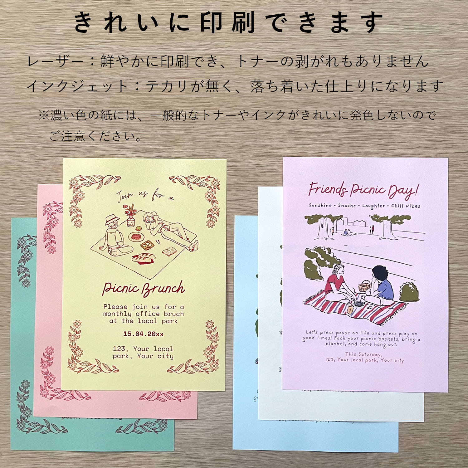 インクジェットプリンタ・レーザープリンタのどちらにも対応可能で、各種筆記具(ボールペン・鉛筆・サインペンなど)でもにじみにくく、きれいに発色します。紙面は凹凸が少ない上質紙のため、手作りカードやPOP制作にも適した紙質です。